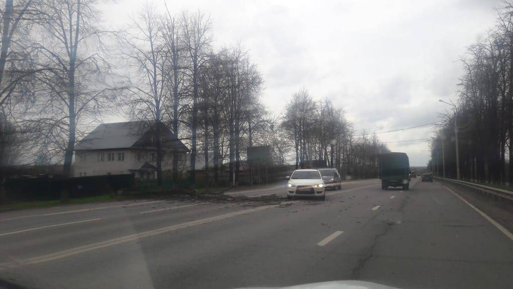 Дерево упало на улице Панфилова, недалеко от здания НИИЭМ, перекрыв две полосы движения в сторону Ново-Иерусалимского монастыря. Водители вынуждены объезжать препятствие по встречной полосе.