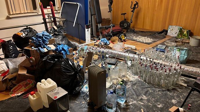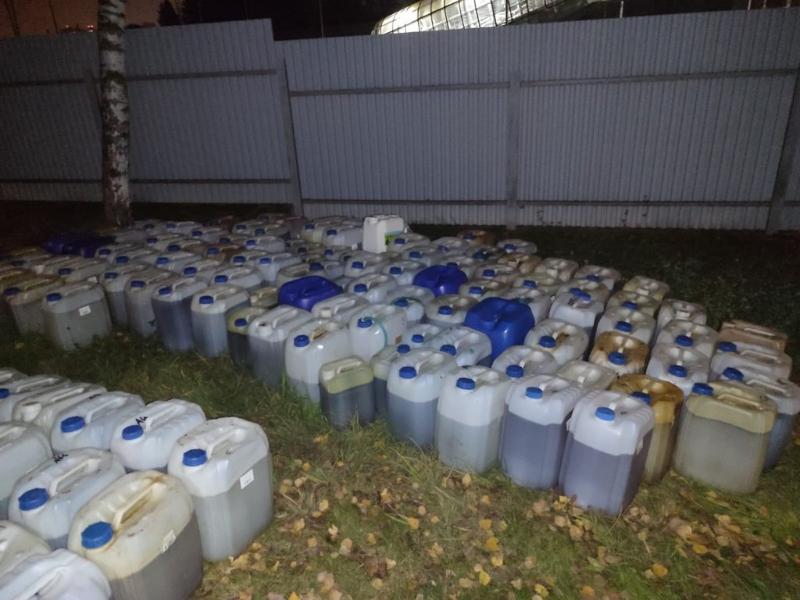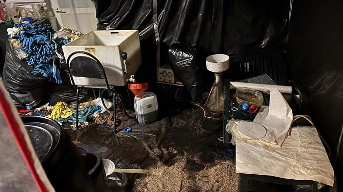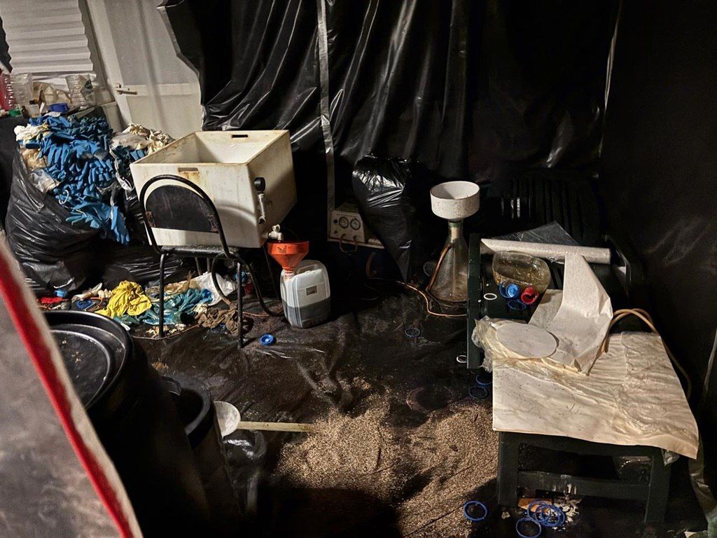 При осмотре полицейскими обнаружено и изъято различное лабораторное оборудование: весы, пластиковые бутылки, колбы, химические реактивы, 172 канистры различной ёмкости с побочными продуктами химического синтеза.