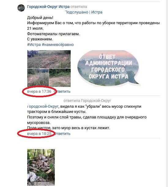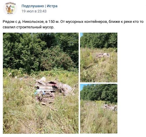 На днях в городском паблике "Подслушано Истра" был опубликован пост о том, что вблизи д. Никольское неизвестные свалили строительный мусор. Спустя двое суток пресс-служба администрации округа отчиталась, что уборка территории была проведена.