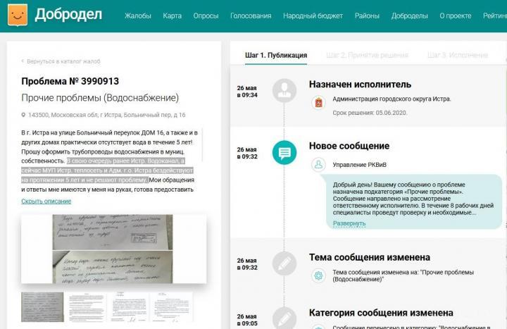 В связи с отсутствием решения проблемы жительница Истры очередной раз записалась на прием к новому, уже четвертому по счёту (только на её памяти), директору уже оптимизированной организации МУП «Истринская теплосеть» Чермашенцеву Е.В. на 25 марта 2020 года. Однако на встречу вышеуказанный чиновник не явился вовсе, а заявительнице пообещали взять решение проблемы на контроль, в связи с чем уже в конце марта текущего года по злосчастному адресу приехала некая бригада, сотрудники которой и сообщили хозяйке, что схема данной сети водопровода имеется в электронном виде, и возвращении в МУП она и будет предоставлена директору организации, который, в свою очередь, должен будет сформировать некую задачу.