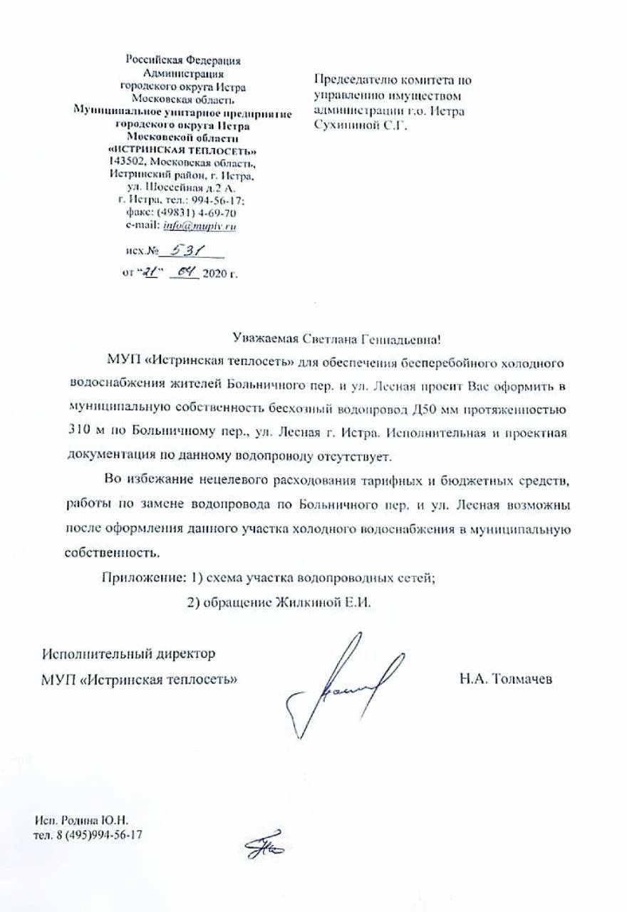 Очередная отписка не заставила себя ждать. 21 апреля текущего года исполнительный директор МУП «Истринская теплосеть» Н.А. Толмачёв сообщил в своем ответе, что водопроводные сети по ул. Больничный переулок, ул. Лесной на балансе организации не числятся: "Для обеспечения требуемого напора необходимо выполнить работы по замене трубопроводов холодного водоснабжения общей протяжённостью 310 метров. Исполнительная и проектная документация по данному водопроводу отсутствует. Во избежание нецелевого расходования тарифных средств выполнение работ по замене будет возможно после оформления данного участка водопровода в муниципальную собственность".