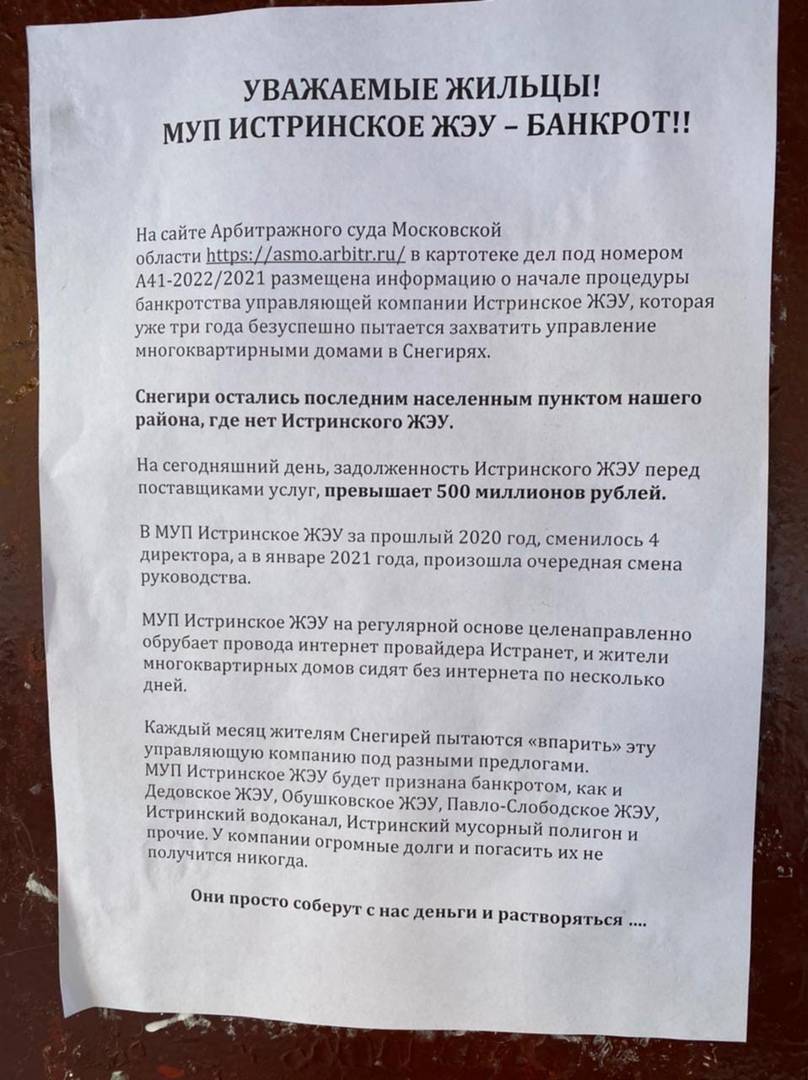 Из сведений, изложенных на сайте компании, следует, что ЖЭУ сегодня обслуживает более 840 многоквартирных домов городского округа Истра. А потому первыми начали паниковать именно владельцы квартир.