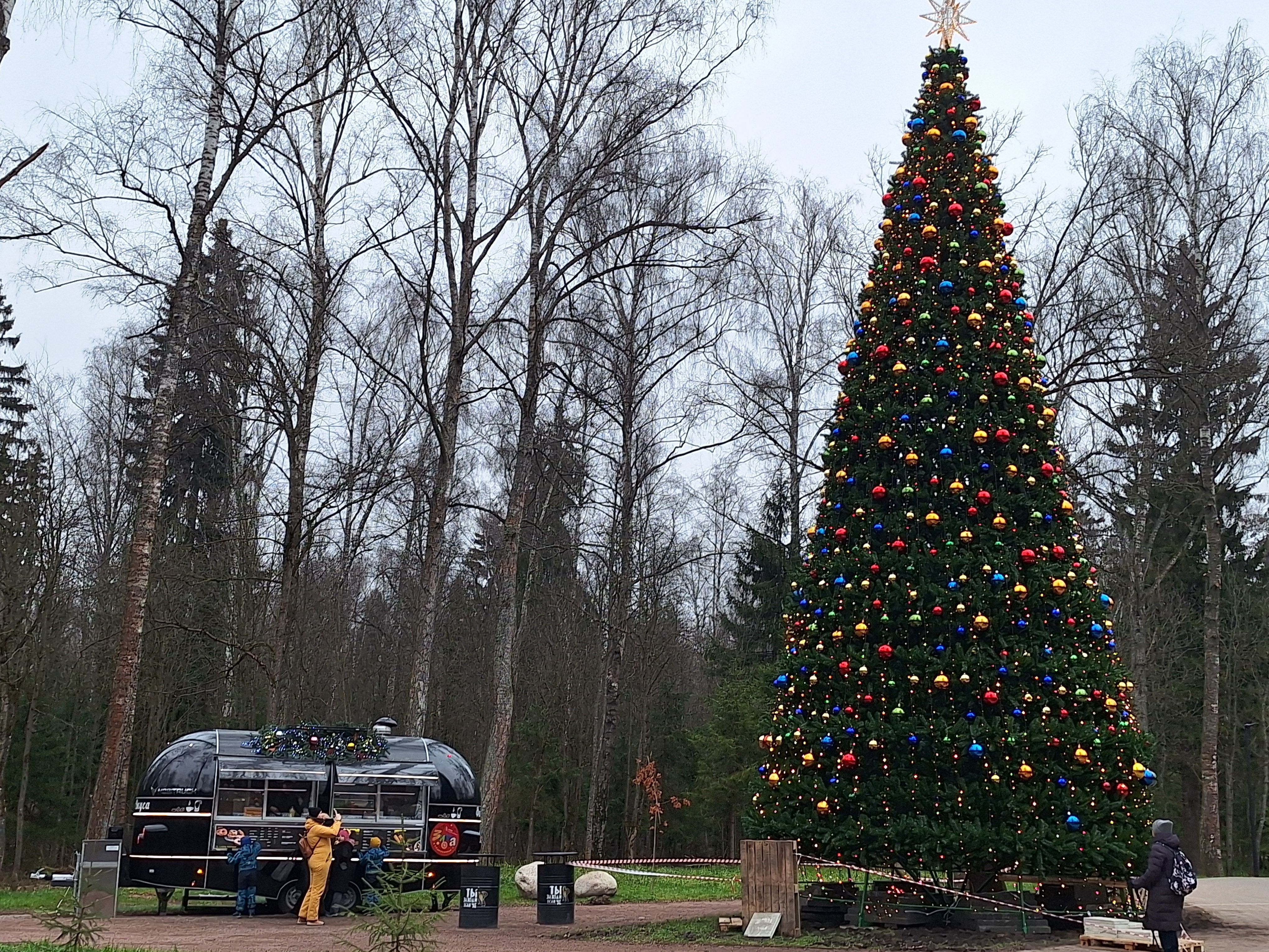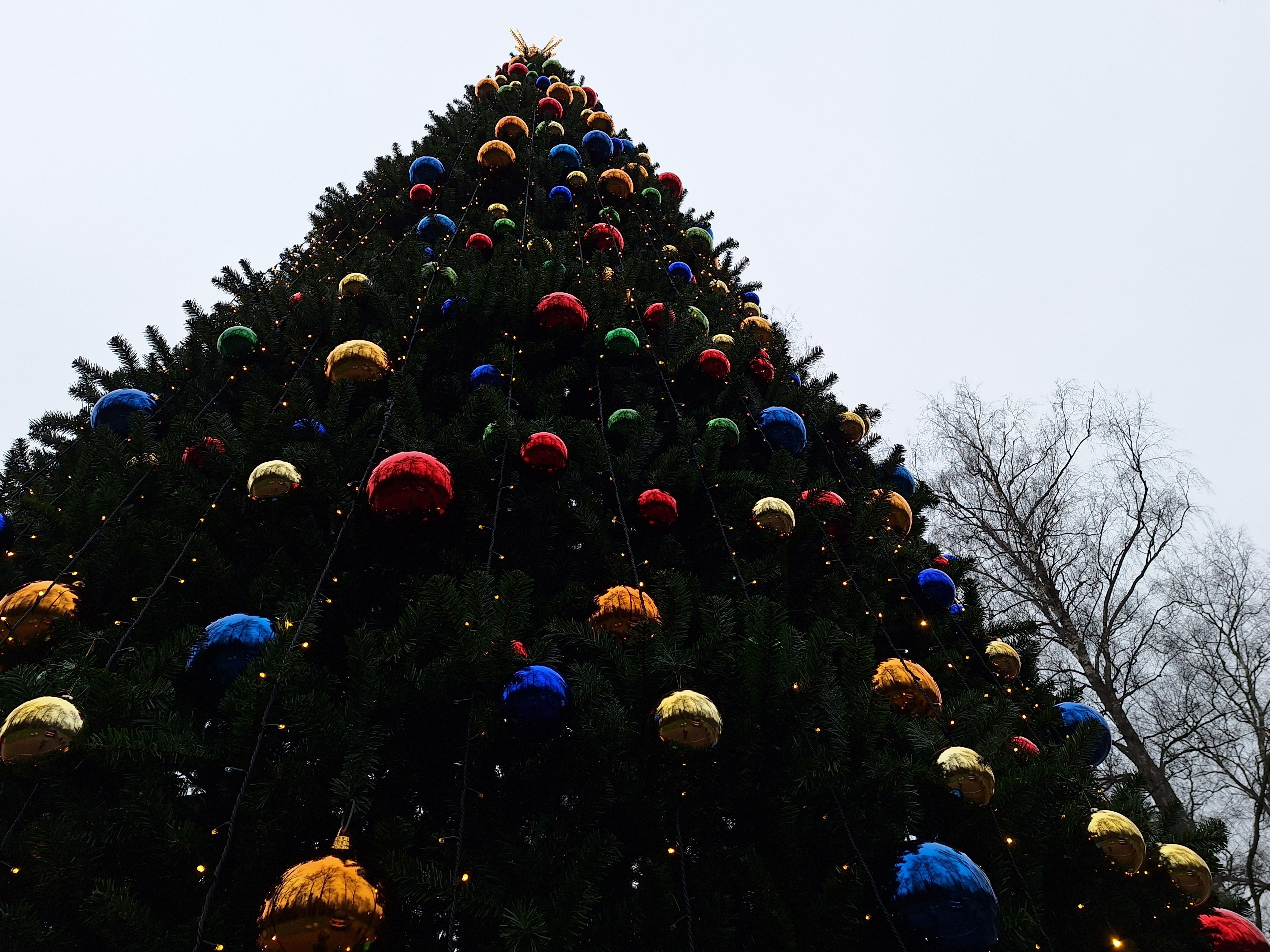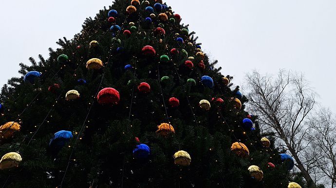 Ёлку начали украшать: на ней уже появились огромные разноцветные шары. Однако работы ещё предстоит много.