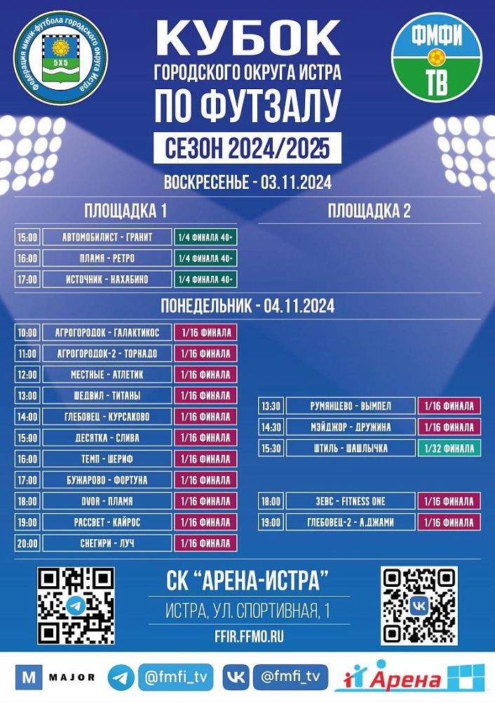 Матчи Кубка г. о. Истра по футзалу стартуют 3 ноября в 15.00 на 1 площадке. 4 ноября матчи пройдут с 10:00 до 21:00 на 1 и 2 площадках.