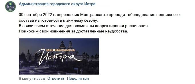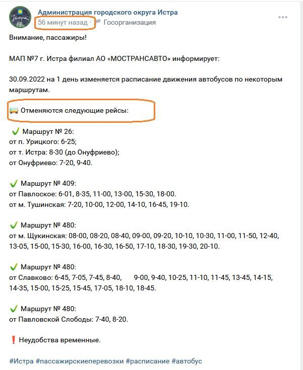 Со ссылкой на МАП №7 г. Истра филиал АО «МОСТРАНСАВТО» пресс-служба администрации г. о. Истра сообщает о том, что отменяются больше 50 рейсов по 3 маршрутам.