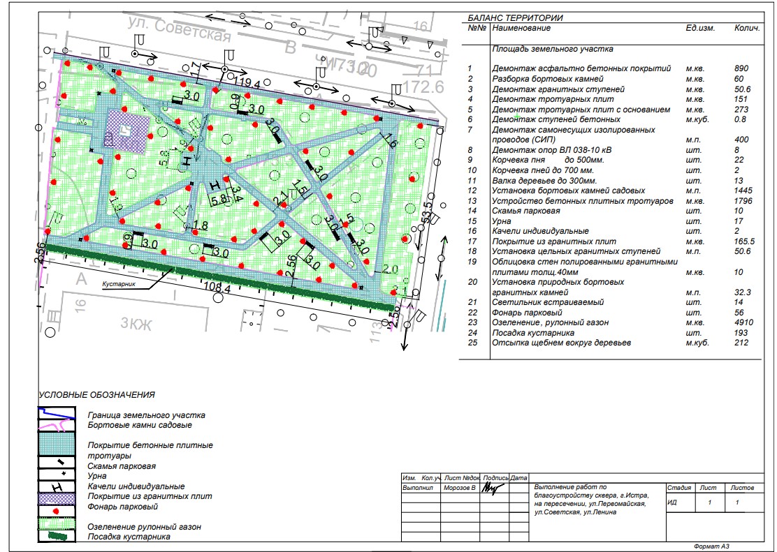 К сожалению, в ходе работ всё же придётся пожертвовать деревьями, чего так не хотели жители. В перечне работ значатся валка 13 деревьев и выкорчёвка 24 пней. Но всё же в сквере не забудут про озеленение: будет посажено 193 кустарника и газон на площади почти 5 000 кв. м.
