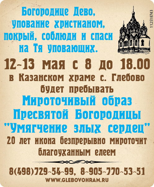 12 и 13 мая с 8 до 18 часов в Казанском храме села Глебово будет пребывать чудотворный образ Пресвятой Богородицы "Умягчение злых сердец", который уже почти 20 лет мироточит благоуханным елеем.