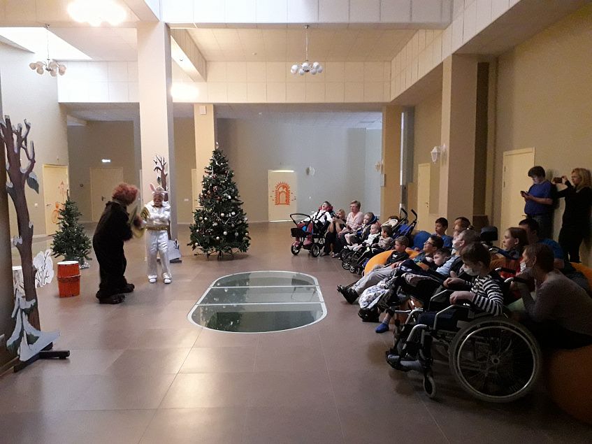 В сказочном, оборудованном по последнему слову техники здании хосписа, им предстояло познакомиться с ребятами и родителями и представить их вниманию спектакль театральной студии «Медведь, который не верил в Деда Мороза».
