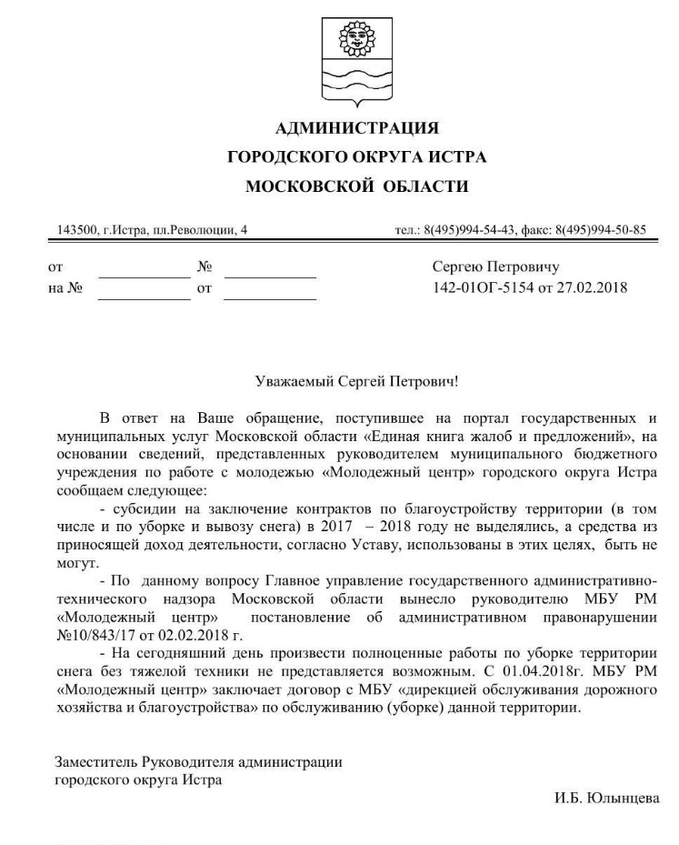 В ответе на обращение на портале "Добродел", в частности, сообщается, что субсидии на заключение контрактов по благоустройству территории (в том числе по уборке и вывозу снега) в 2017 - 2018 году не выделялись, а средства из приносящей доход деятельности Молодёжного центра, согласно его Уставу, не могут быть использованы в этих целях.