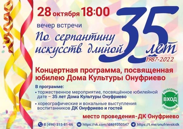 28 октября в 18:00 приглашаем жителей и гостей округа в ДК Онуфриево на вечер встречи «По серпантину искусств длиной 35 лет».