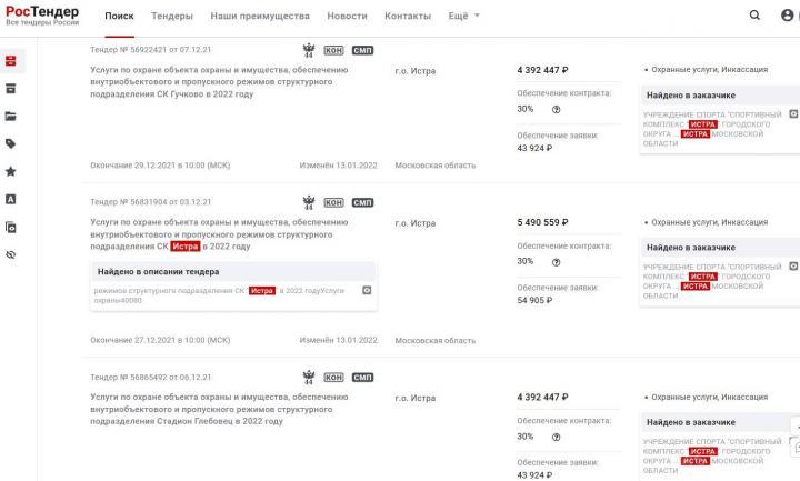 В Истре определились с подрядчиком на оказание услуги по охране имущества, обеспечению внутриобъектового и пропускного режимов структурных подразделений в 2022 году. Речь идёт о двух спорткомплексах, «Гучково» и «Истра», а также о стадионе «Глебовец».