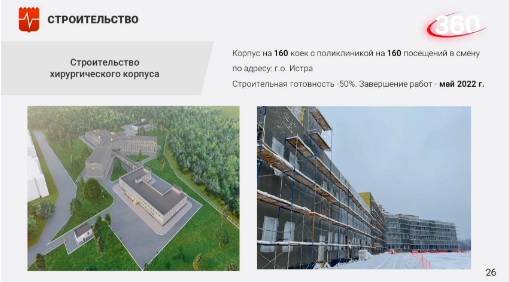 «Завершение работ в мае 2022 года. Напомню, это стационар на 160 коек и поликлиника на 160 посещений в смену».