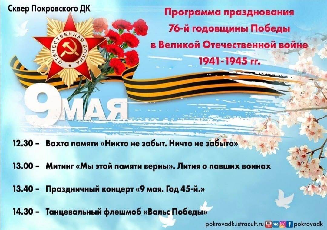 В этот же день, 9 мая, истринцев и гостей города приглашают в 13:00 и в Истринский городской парк на мероприятие, посвящённое Дню Победы в Великой Отечественной войне. В программе праздника — традиционное возложение цветов, военно-историческая реконструкция и праздничный концерт.