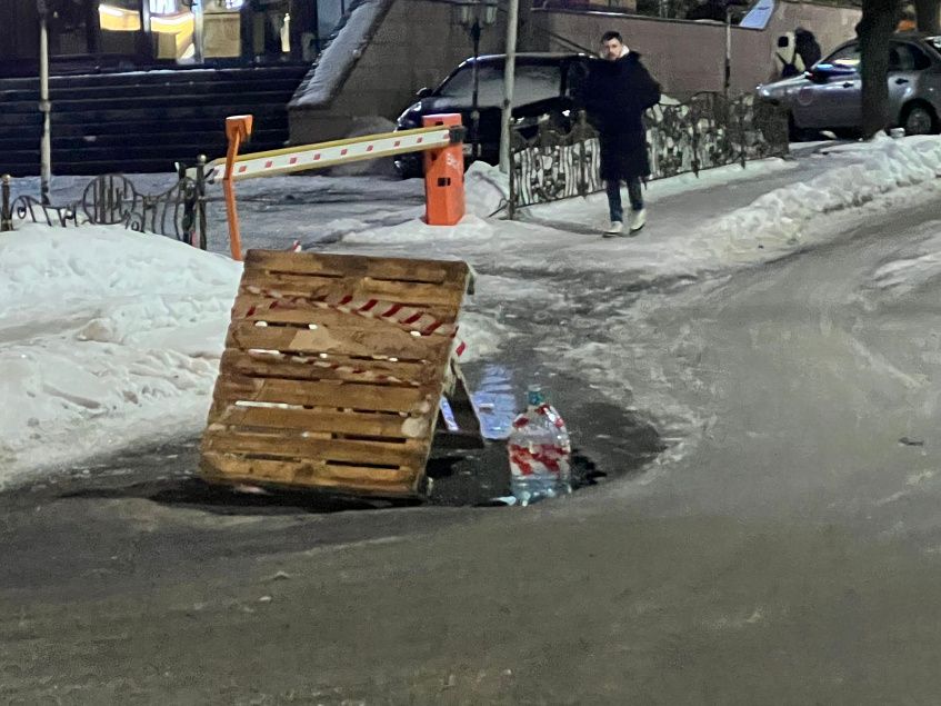 Часть канализационного люка, который ремонтировали не один раз за зиму, вновь провалилась, утянув за собой и асфальт. Опасный объект на улице Морозова в очередной раз огорожен.