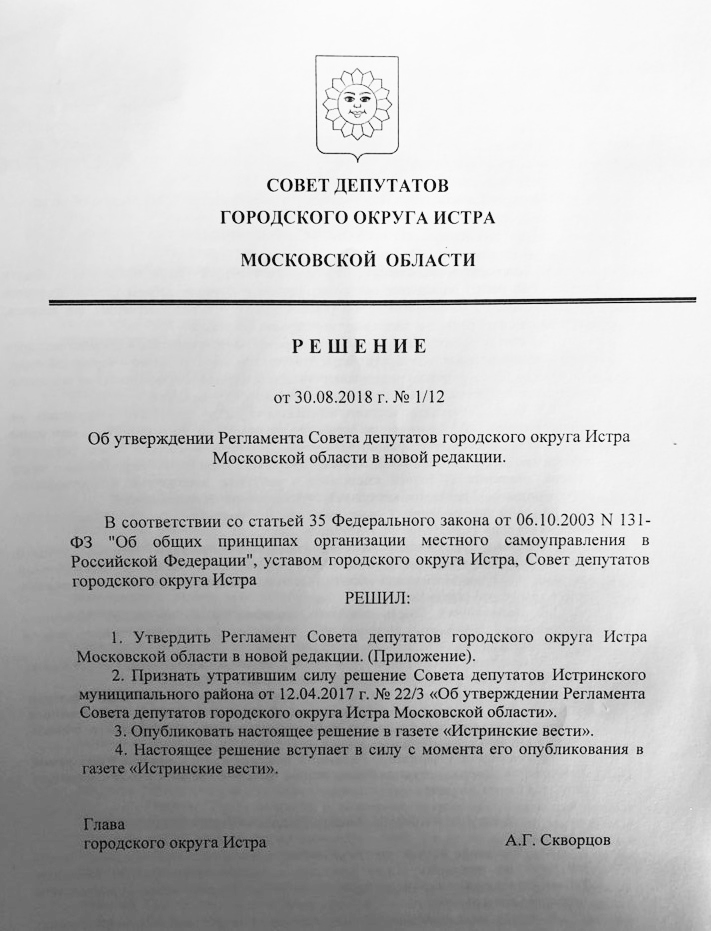 В частности, в документе говорится, что на нулевом заседании нового Совета, которое должно пройти не позднее чем через 15 дней после даты выборов (9 сентября), назначается заместитель председателя Совета депутатов г.о. Истра. При этом это назначение находится в компетенции самого председателя. Из этого и следует, что руководителя нового Совета депутатов выберут тогда же, 24 сентября.