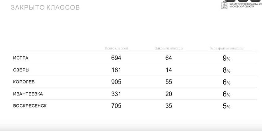 «В таблицу мы вывели топ муниципалитетов, где максимальный процент закрытых классов на ковид. Это Истра, Озеры, Ивантеевка, Королёв и Воскресенск», — отметила докладчица.