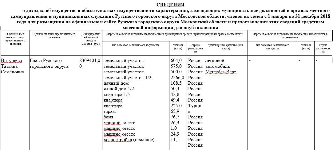 В этот же период 2018 года, о котором говорится в декларации, Татьяна Витушева приступила к обязанностям главы г. о. Руза. В связи с этим данные о её доходах также вошли в «Антикоррупционную декларацию за 2018 год муниципальных служащих Рузского городского округа».