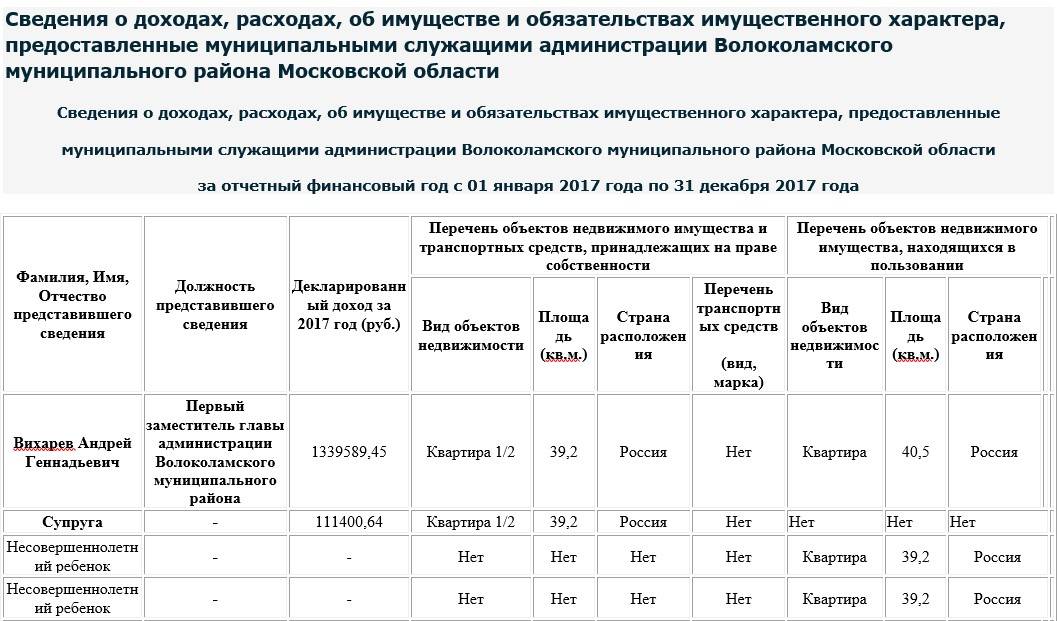 В декларации за 2017 год, когда Андрей Вихарев был главой Волоколамского района, денежный доход представителя власти был ненамного меньше (1 339 589,45 рублей), в отличии от супруги – здесь цифра выросла в более чем 10 раз – (111 400,64 рублей).