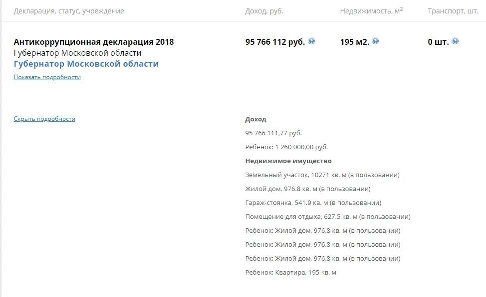 Что касается дохода губернатора, то в 2018 году он составил более 95 млн. рублей (95 766 111,77 рублей). В графе со сведениями о близких упоминается ребёнок с доходом 1 260 000,00 рублей.