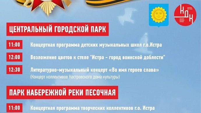 В Центральном городском парке и в парке на набережной реки Песочная, на площадях у Дедовского и Истринского Домов культуры пройдут музыкальные, литературные и театрализованные концертные программы.
