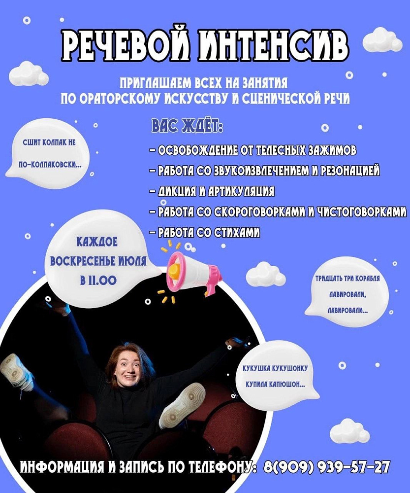 Вести занятия будет руководитель образцового коллектива театральной студии «Мозаика» Юлия Ольхова. Она поделится своим богатым опытом в постановке сценической речи.