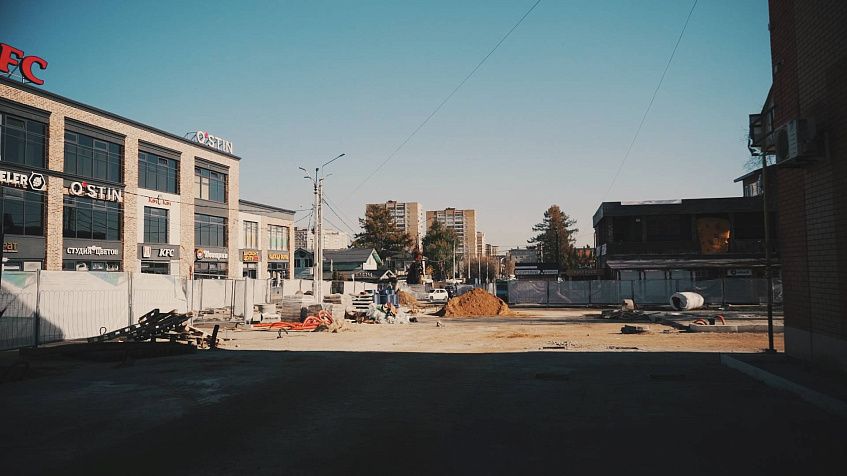 Площадь Урицкого не узнать. Исчезла парковка для посетителей МФЦ. Левее, в сквере, на пешеходной дорожке также ведутся ремонтные работы. На информационном щите обозначена дата окончания строительства — апрель 2022 года.