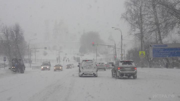 Сильный порывистый ветер со снегом стал причиной снежных заносов и плохой видимости на дорогах и, как следствие, возникновения пробок.