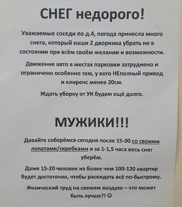 Однако комментарии пишут далеко не все. Многие взялись за лопаты и вышли на помощь и себе, и тем, кому по долгу службы пришлось непросто в эти снежные дни.