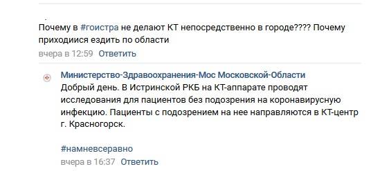 Напомним, буквально вчера в Минздраве на вопрос, почему нельзя пройти обследование на КТ-аппарате в Истре, ответили, что в настоящее время аппаратура используется исключительно для проведения исследований пациентам без подозрений на коронавирусную инфекцию.