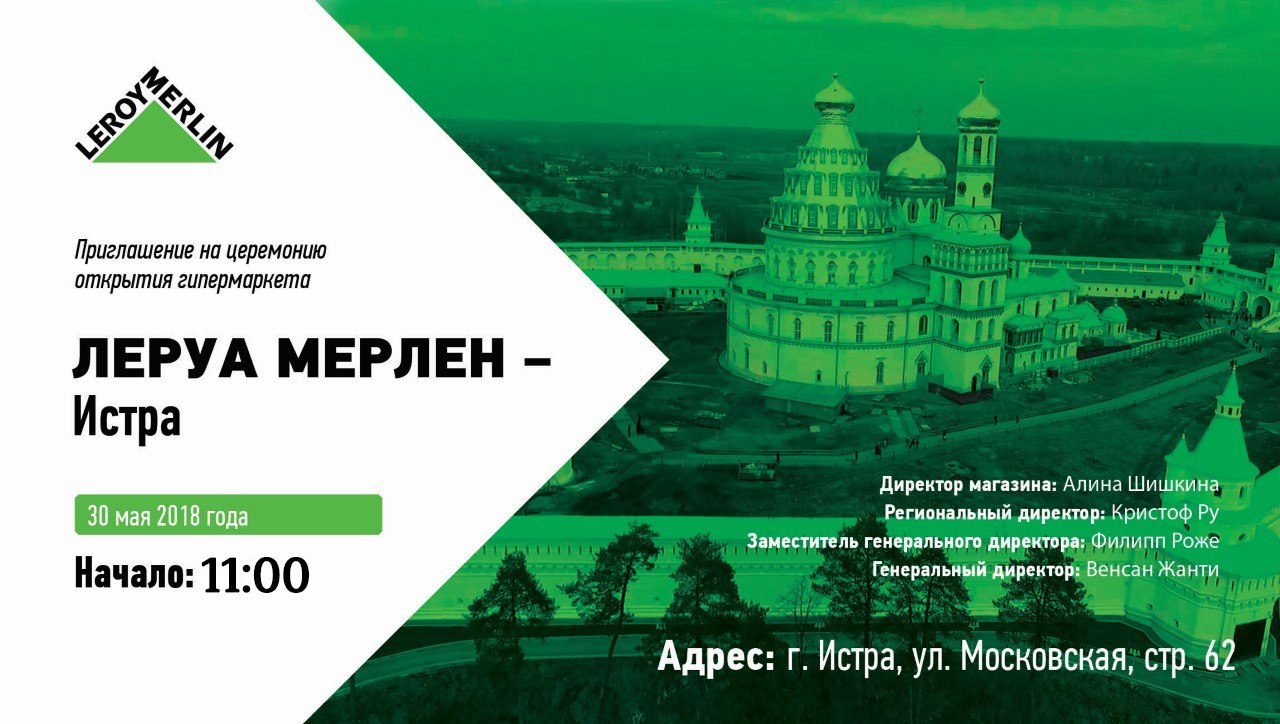 По официальной информации, открытие магазина "Леруа Мерлен Истра" состоится 30 мая 2018 года в 11:00.