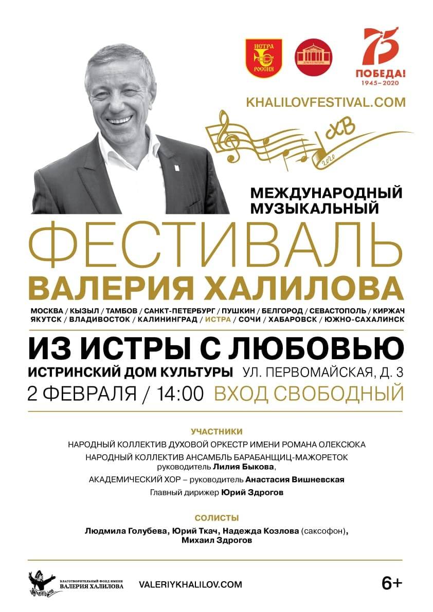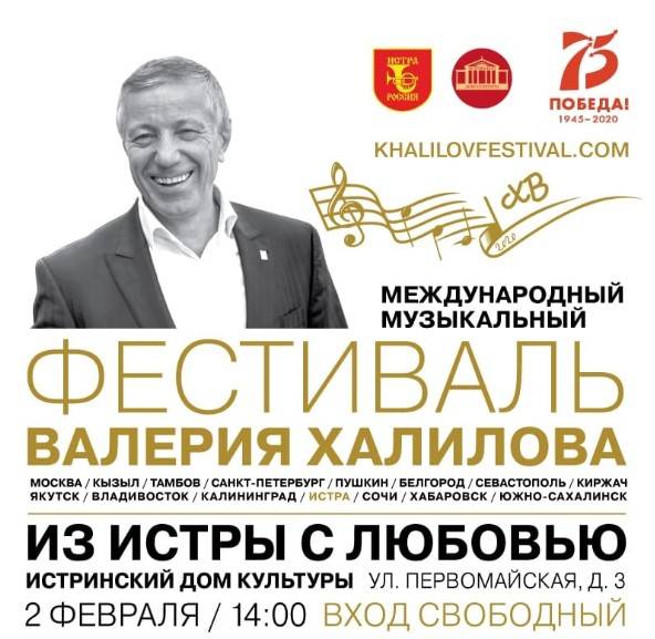 Международный музыкальный фестиваль памяти народного артиста России, художественного руководителя ансамбля им. А.В. Александрова Валерия Халилова пройдёт в 15 городах России с 29 января по 2 февраля 2020 года. Он приурочен ко дню рождения дирижёра и композитора.