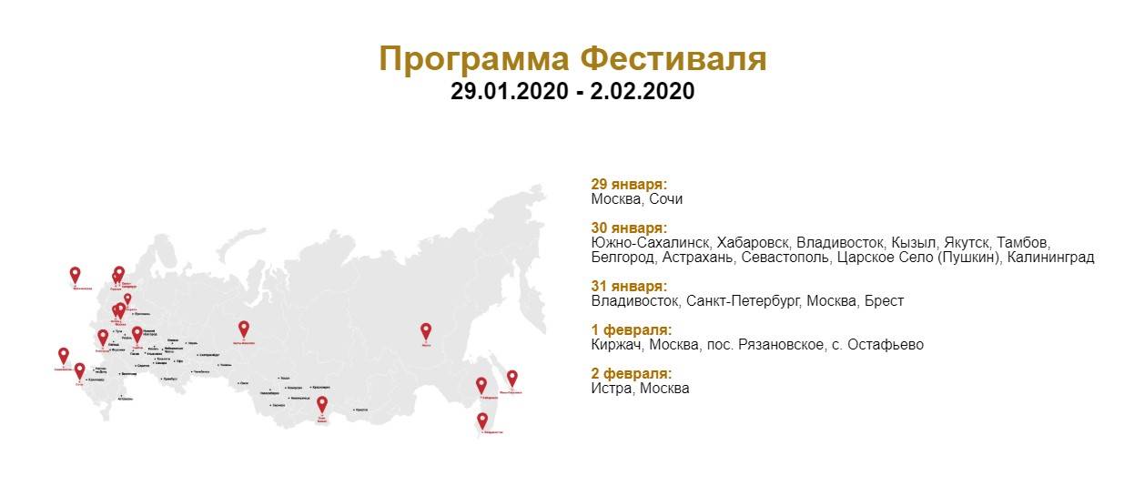 Откроется фестиваль молебном в Богоявленском кафедральном соборе в Елохове 29 января в 12.00. В день рождения маэстро, 30 января, военные ансамбли и хоры выступят в Южно-Сахалинске, Хабаровске, Владивостоке, Кызыле, Якутске, Тамбове, Белгороде, Астрахани, Севастополе, Царском Селе (Пушкин), Калининграде.
