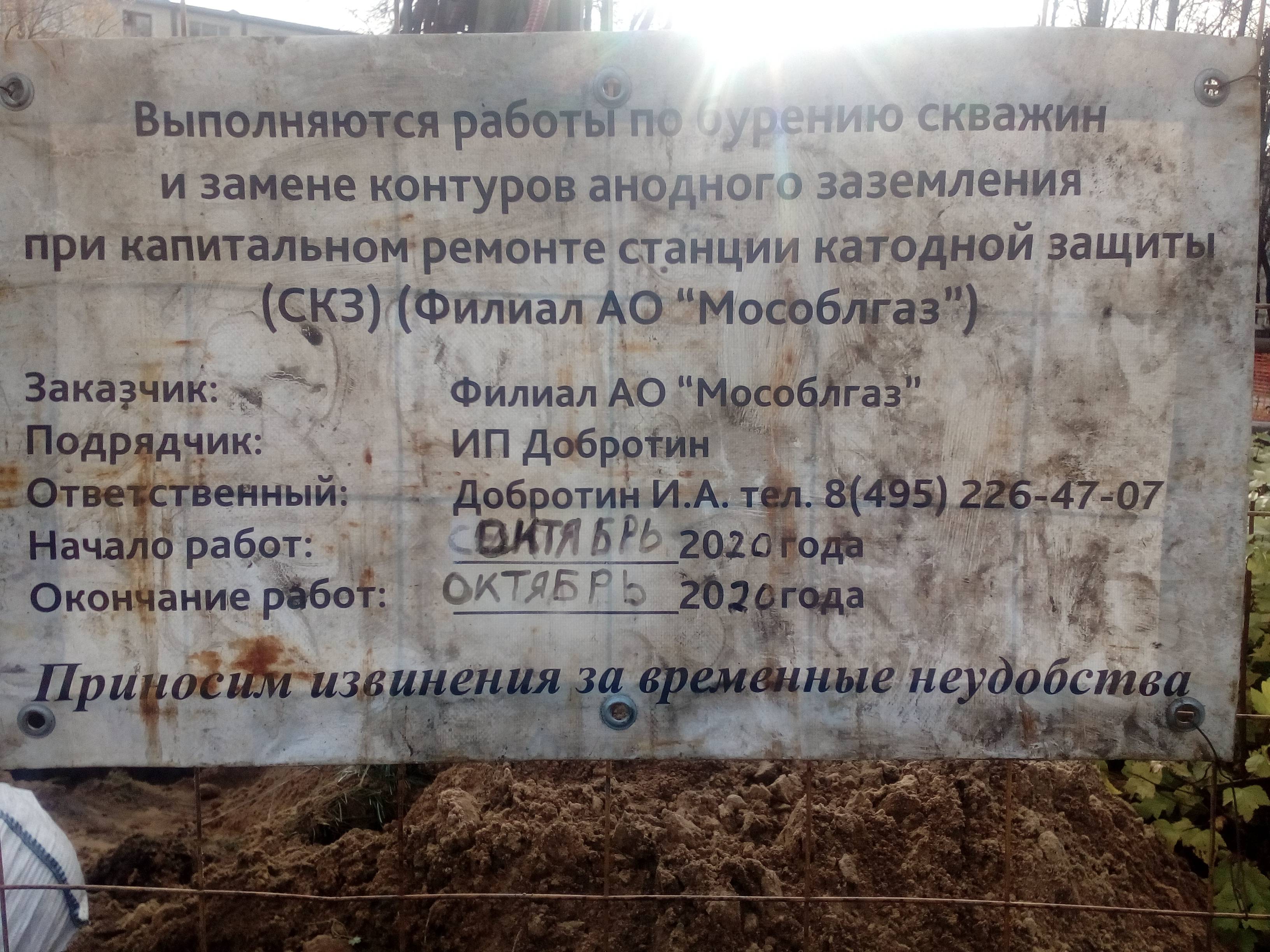 Заказчиком данных работ является филиал АО "Мособлгаз", сами же работы выполняет подрядчик, "ИП Добротин". Окончание работ, согласно информационному щиту, планируют уже в октябре текущего года.