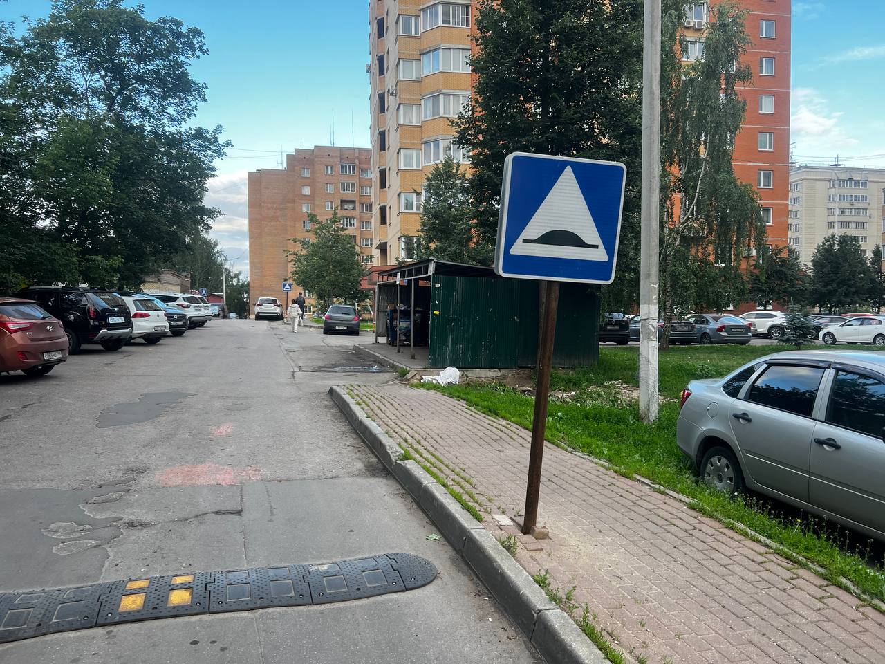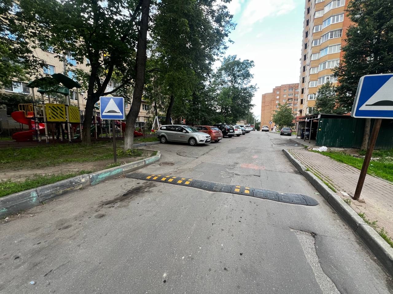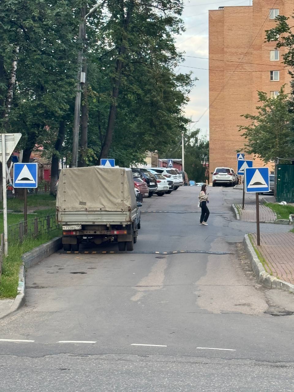 Знаки стоят на кривых, ржавых металлических столбах. Служба установки не пожалела знаков, установив целых 6 единиц буквально через каждые 10 м метров, прямо во дворе жилого дома.