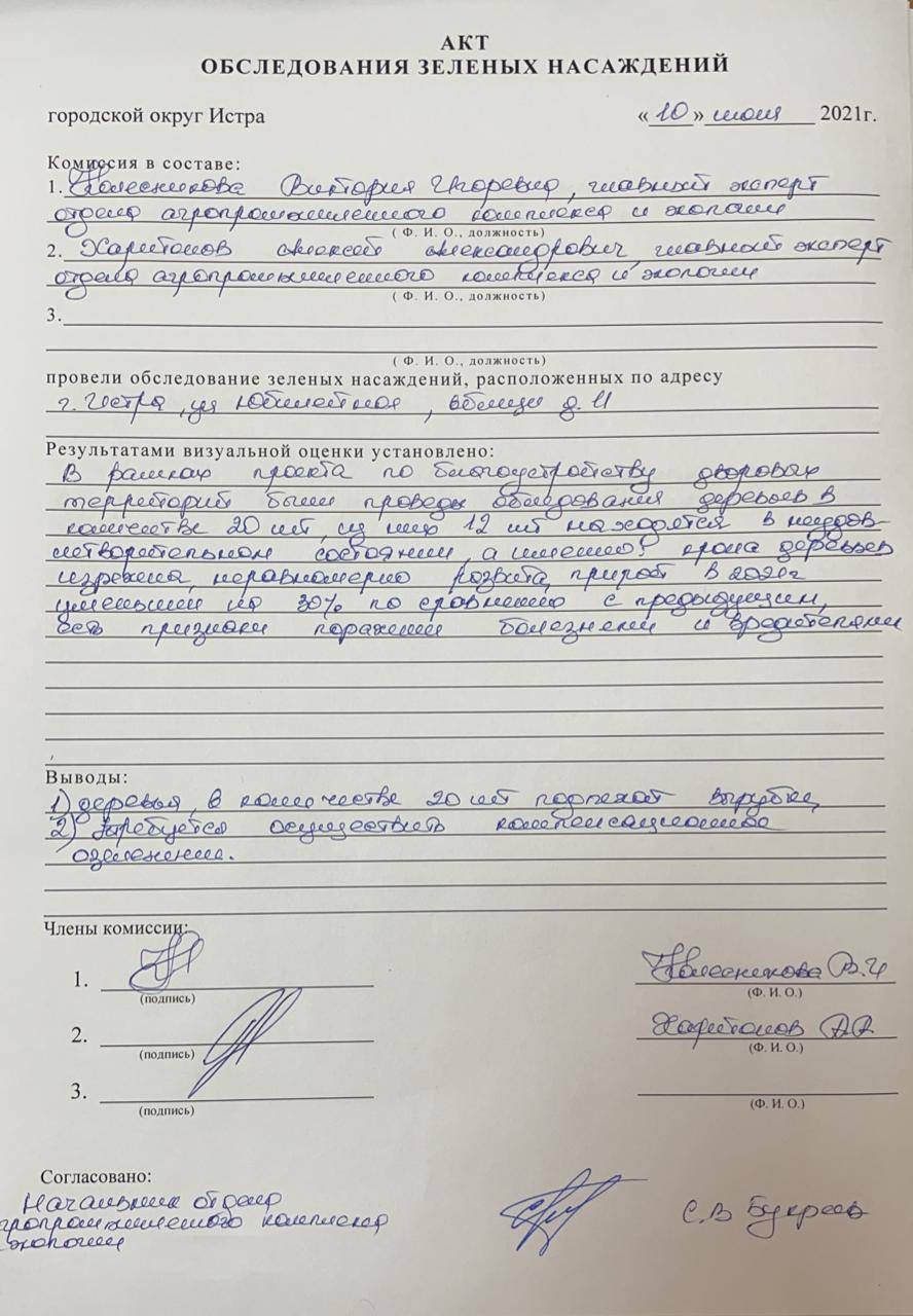 Так, по словам заместителя главы администрации городского округа Истра Людмилы Тодд, в рамках проекта по комплексному благоустройству дворовой территории были проведены работы по обследованию деревьев, находящихся по вышеуказанному адресу, в количестве двадцати единиц.