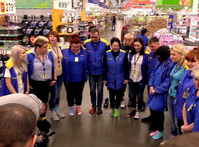 Сотрудники гипермаркета "Лента" совместно с общественным деятелем Михаилом Прохоровым надели разноцветные носки, чтобы обратить внимание общества на проблемы людей с синдромом Дауна.