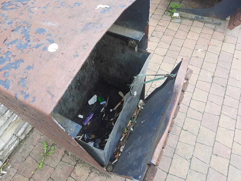 В районе пешеходной зоны на улице Ленина гостей и жителей города встречает необычная урна. То есть сама по себе урна вполне обыкновенная, но, мягко скажем, слегка развалившаяся. Фасад её, видимо, устал и решил отвалиться, то ли не выдержав напора мусора, то ли ввиду истекшего срока эксплуатации, то ли, как теперь часто говорят, из-за неблагоприятных погодных условий.