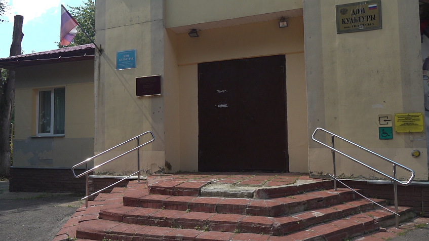 Клуб действительно ветхий. Ступеньки сломаны, на крыше болтается такой же видавший виды, как и само здание, флаг. Однако окна здесь пластиковые, видно, что не старые, на окнах занавесочки.
