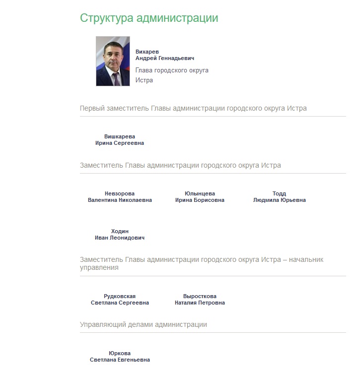 На сегодняшний день структура руководства округа претерпела разительные изменения. Теперь, согласно решению Совета депутатов, у главы г. о. Истра всего один первый заместитель — им стала Ирина Вишкарева. Вопросы безопасности отныне будет курировать Иван Ходин.