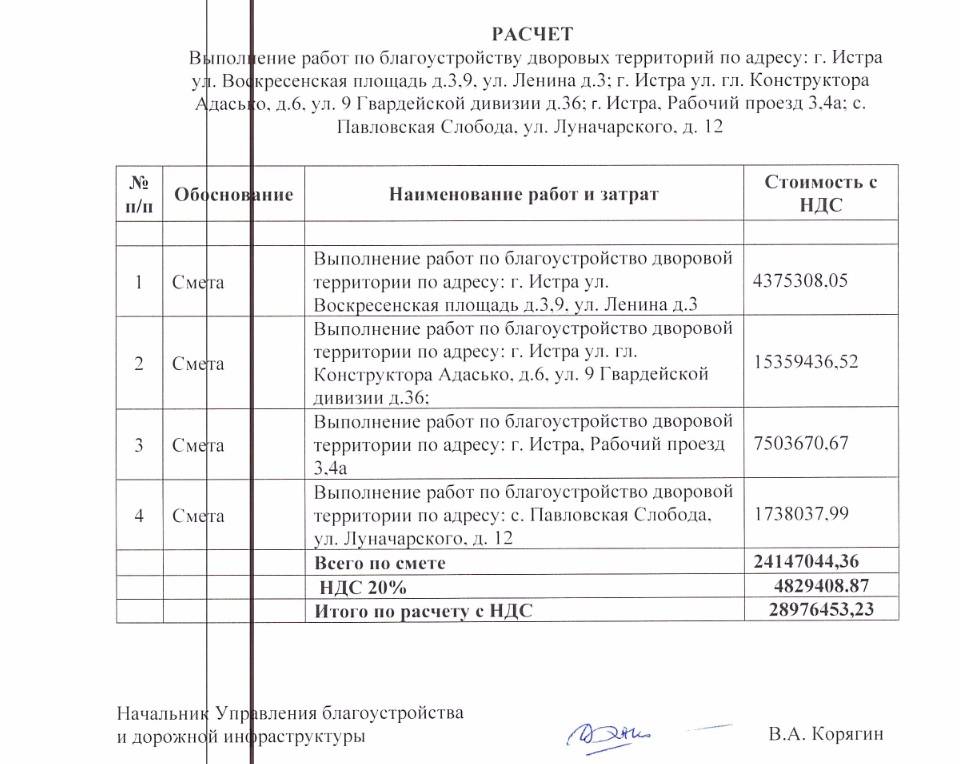 Цена вопроса — двадцать восемь миллионов девятьсот семьдесят шесть тысяч четыреста пятьдесят три рубля. Источник финансирования — бюджет городского округа Истра. При этом почти половина всей суммы уйдёт на благоустройство одной из трёх представленных дворовых территорий города Истра.