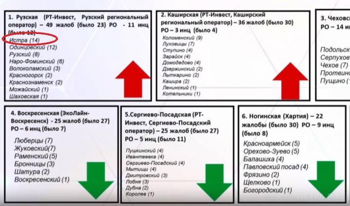 Истринский округ вновь в первых рядах по жалобам на тему мусора. Рузский и Каширский региональные операторы оказались в аутсайдерах по данному вопросу. Так, за неделю зафиксировано около 50 жалоб на Рузского перевозчика (23 на прошлой неделе), из них 14 жалоб поступило непосредственно от истринцев.