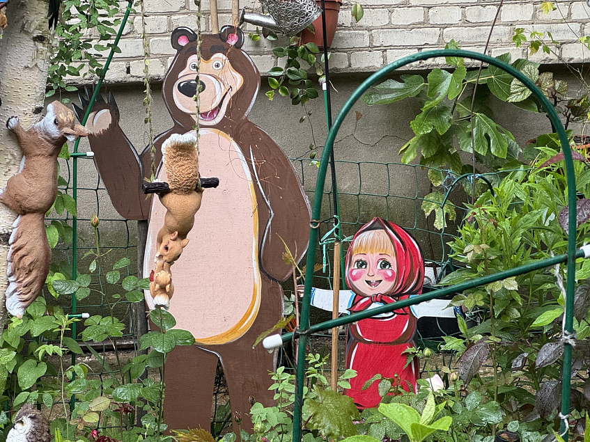 Своими руками она создала настоящий райский уголок, в котором среди цветов обитают герои сказок: избушка Бабы Яги вместе с хозяйкой, Маша и Медведь, Емеля на печи, Серый Волк, Кот в сапогах.