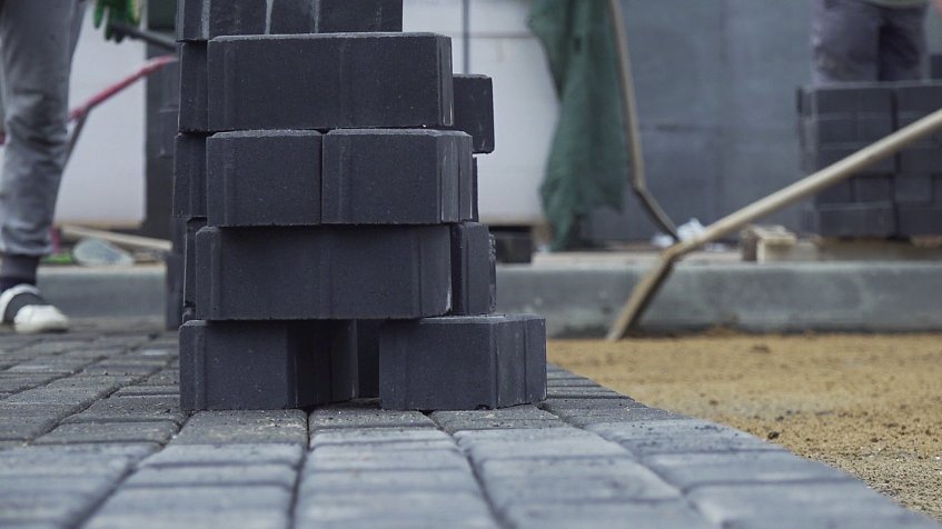 Благоустройство в центре города у нового делового центра продолжается, рабочие уже выложили 3/4 парковки брусчаткой.