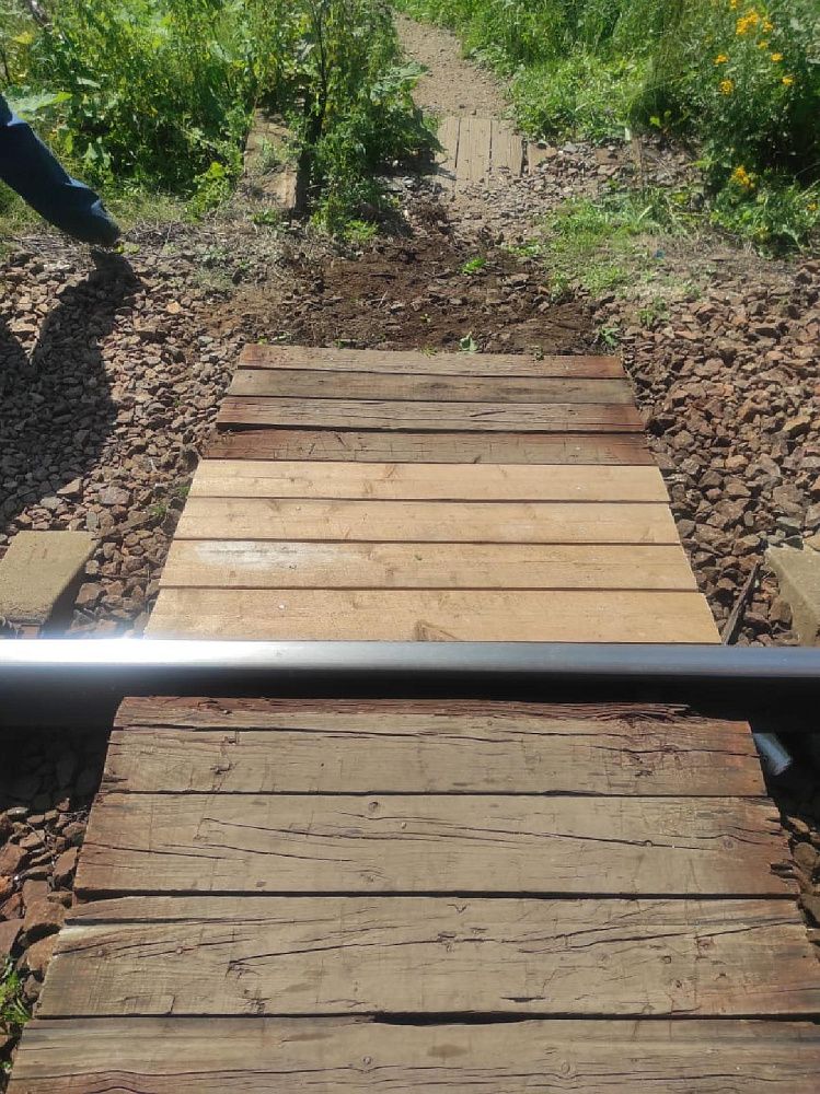 После очередной жалобы на прорехи в деревянном настиле на пешеходном переходе через рельсы, было заменено несколько досок. При этом тот факт, что настил ведёт в грунт, который после каждого дождя превращается в грязь, остался незамеченным: щебня на подсыпку не нашлось.