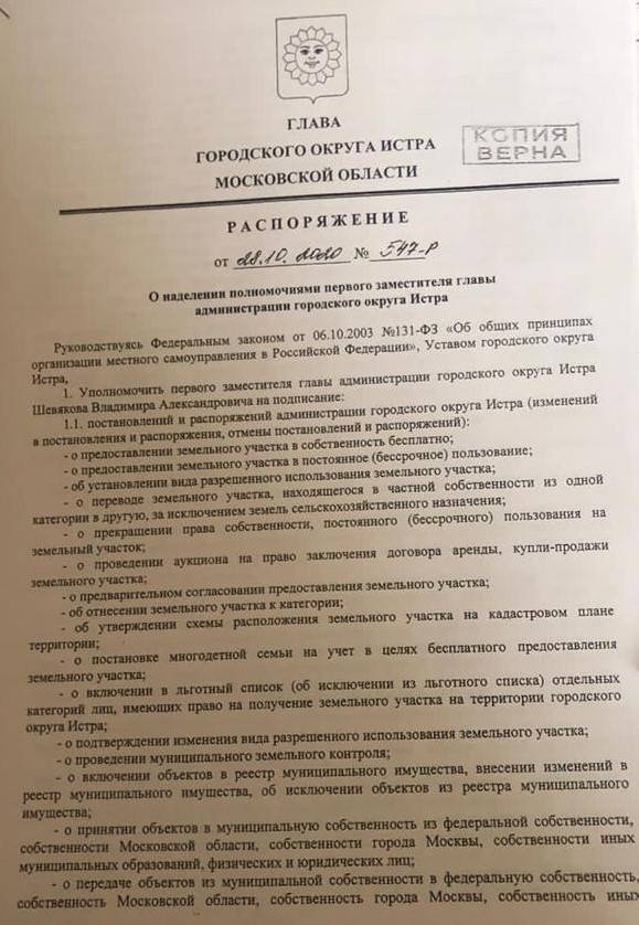 «Уполномочить первого заместителя главы администрации г. о. Истра Владимира Шевякова на подписание...» — говорится в документе. Далее приводится длинный список полномочий на четырёх страницах, включающих в себя более 30 пунктов, в том числе подписание различного рода и важности документов.
