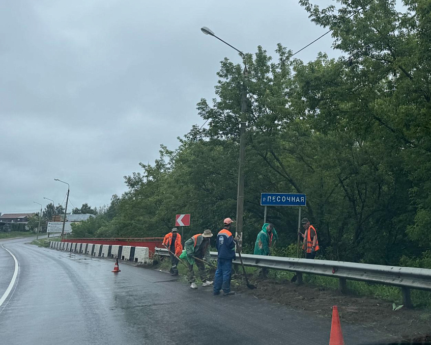 Рабочие убирают грунт, принесённый потоками воды после обильных осадков.