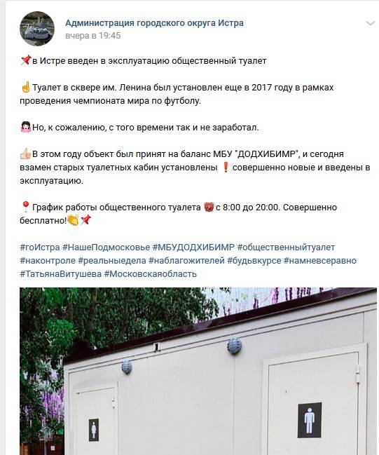 "В Истре введен в эксплуатацию общественный туалет. Туалет в сквере им. Ленина был установлен еще в 2017 году в рамках проведения чемпионата мира по футболу. Но, к сожалению, с того времени так и не заработал", — говорится в сообщении пресс-службы администрации г.о.Истра.