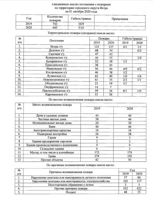 По данным ежедневного анализа обстановки с пожарами ОНД и ПР по городскому округу Истра, на 1 октября в округе зафиксировано 645 пожаров, в которых погибло пять человек. К слову, исходя из статистики за аналогичный период прошлого года, их количество сократилось почти на сто.