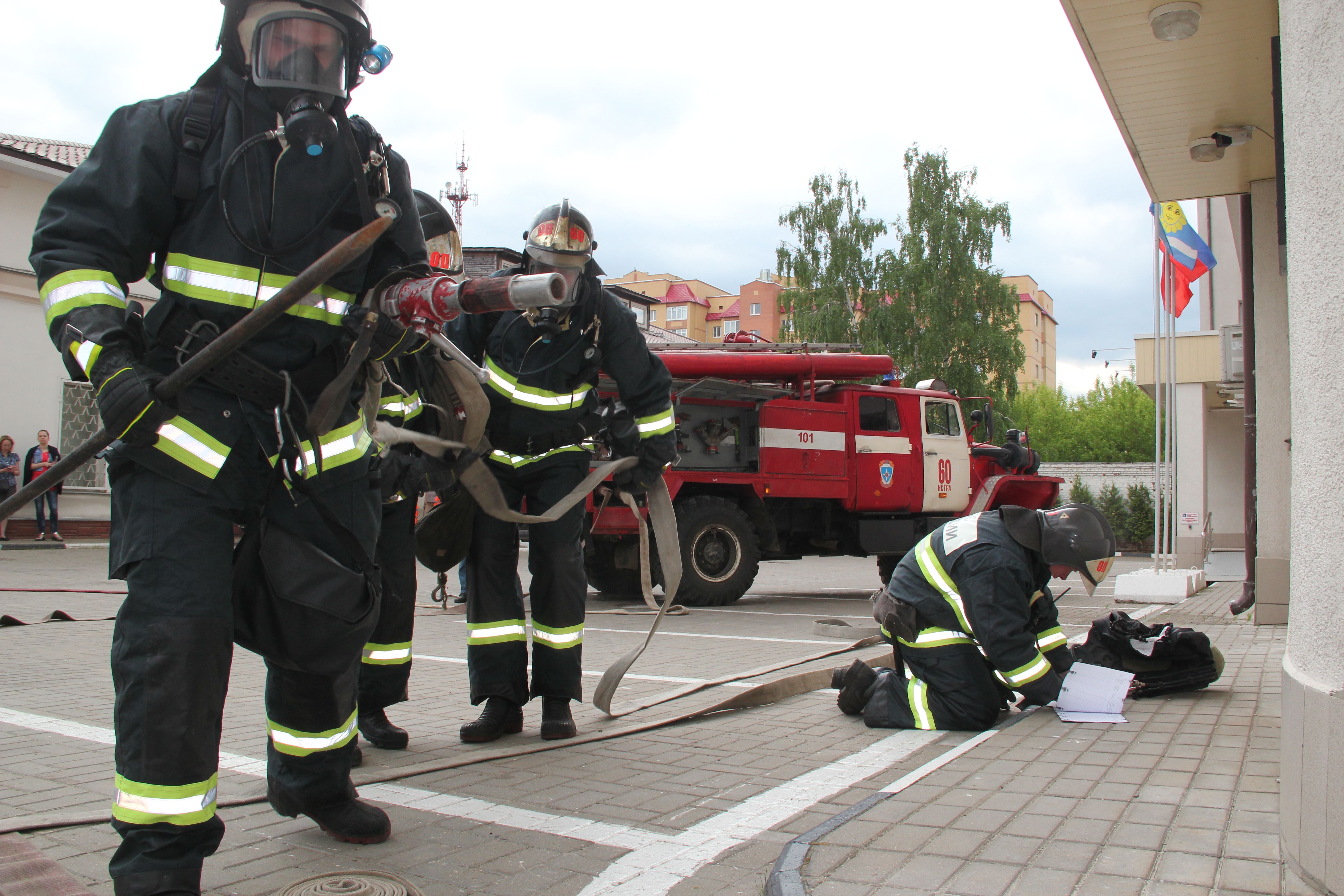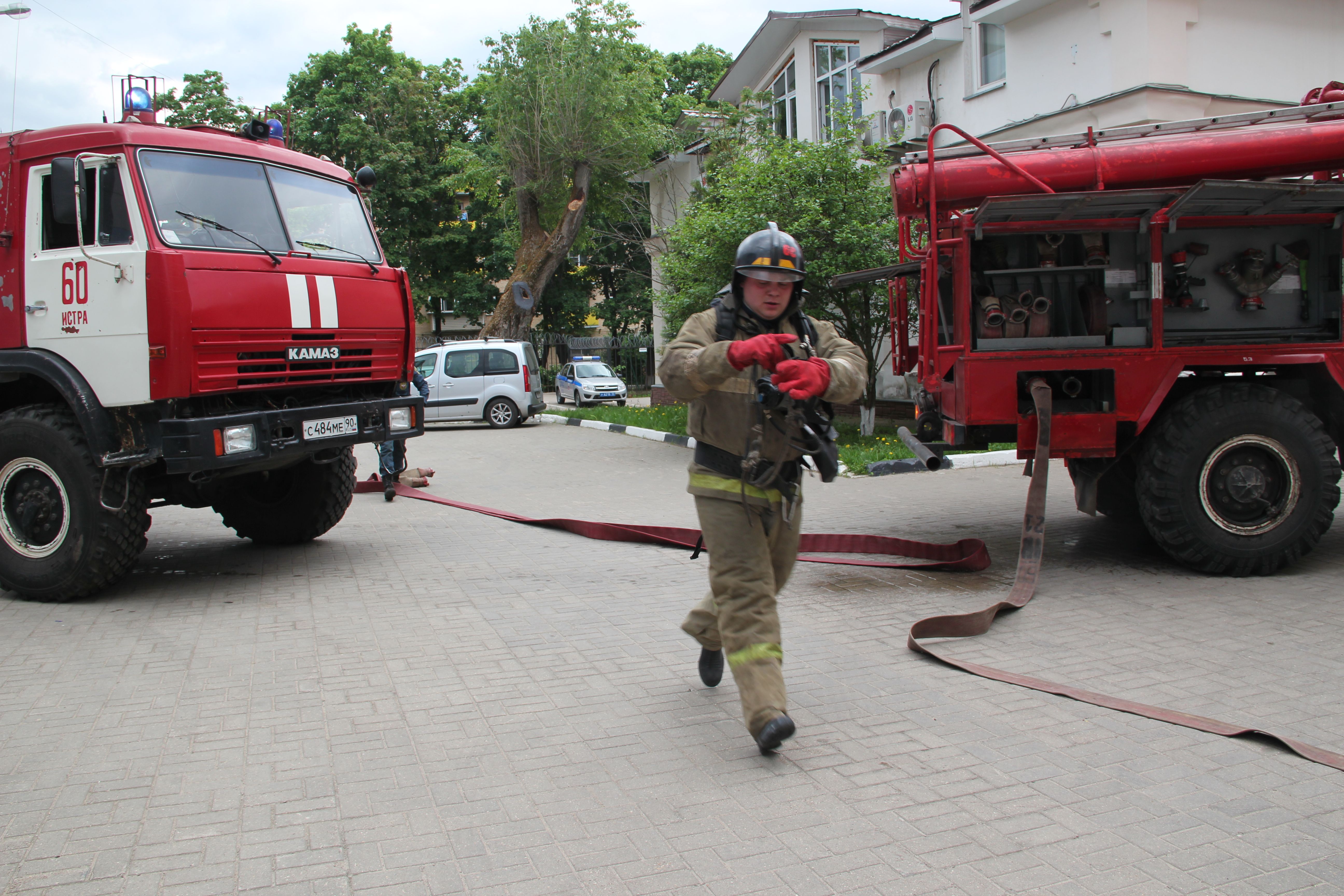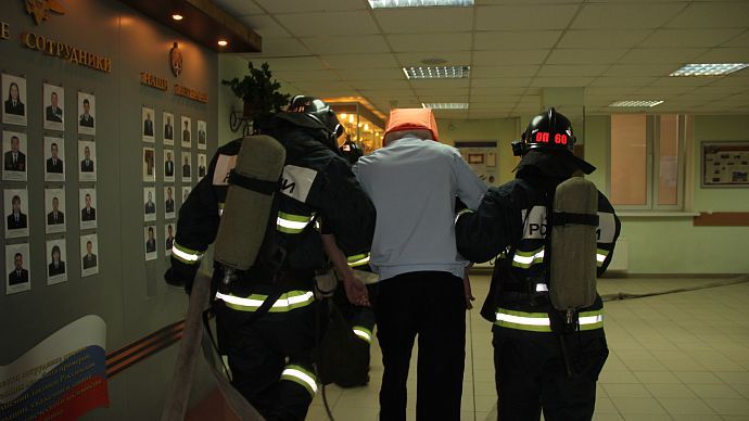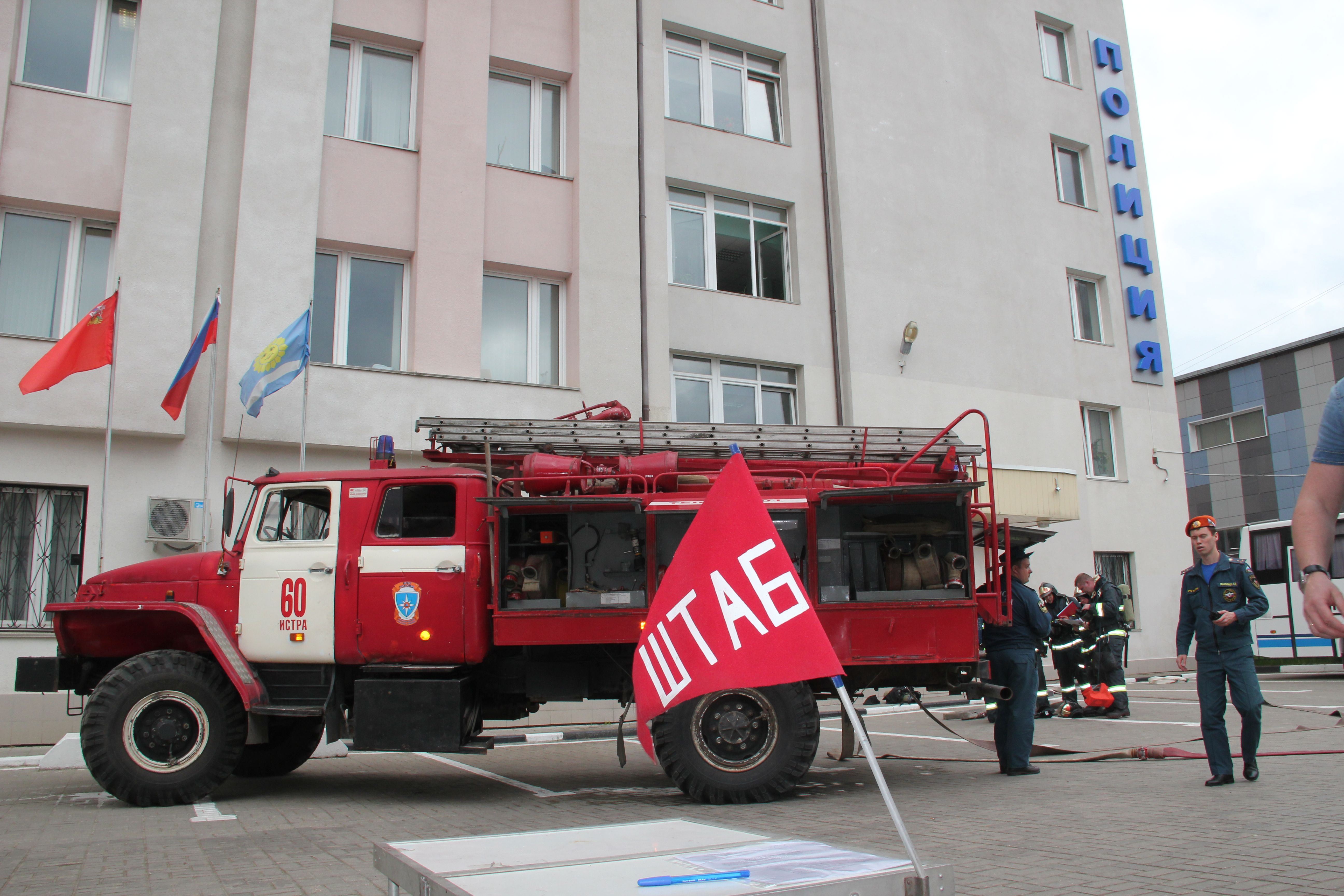 По сценарию учений, по каким-то причинам произошло возгорание в кабинете на 2 этаже здания. Огонь разгорелся очень быстро, создалась угроза его распространения на соседние кабинеты. На тушение условного пожара привлечено 4 пожарные бригады: спасатели пожарной части № 60 города Истра и 331 пожарная часть Одинцовского территориального управления "Мособлпожспас".