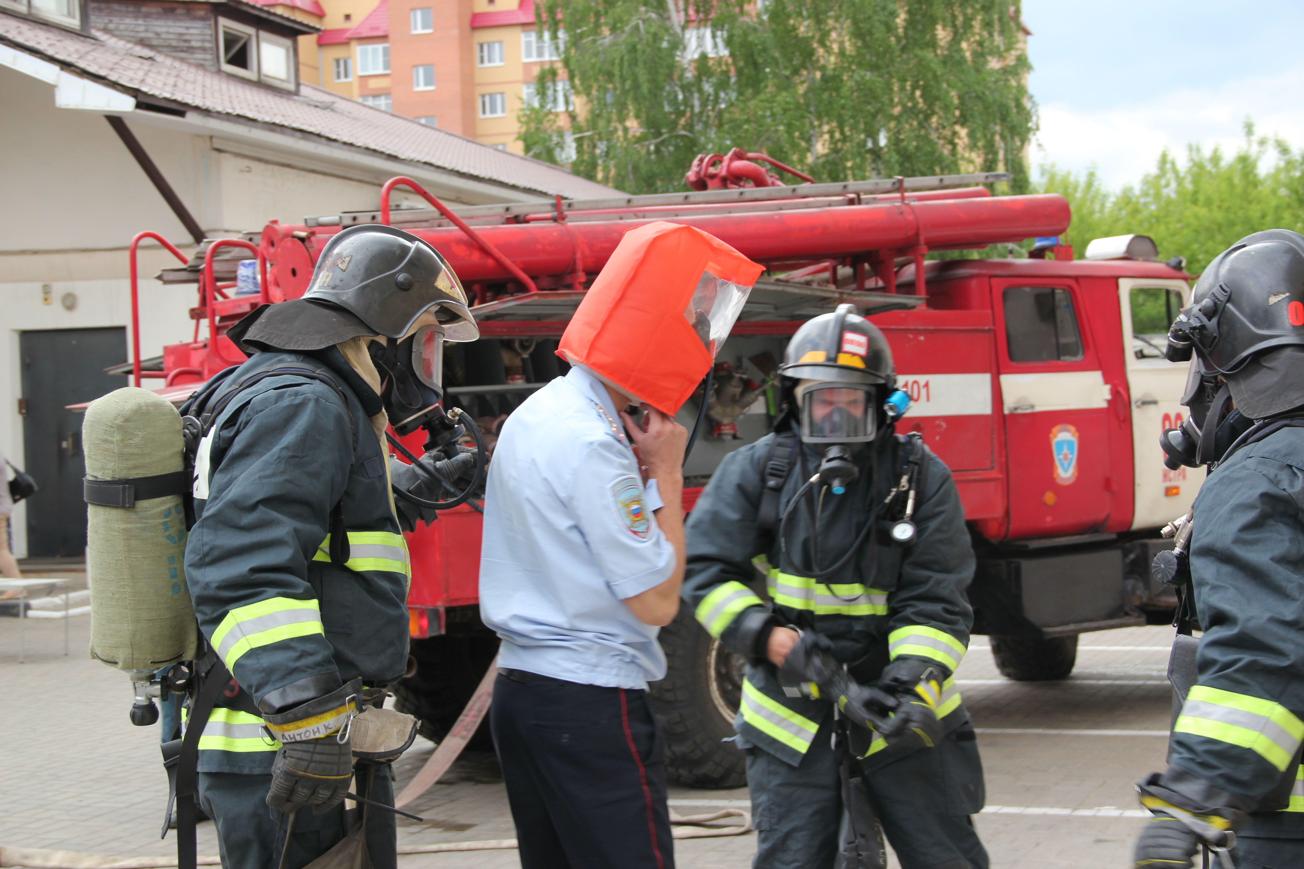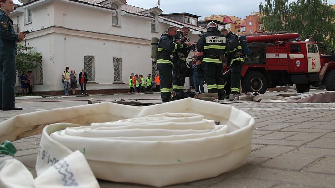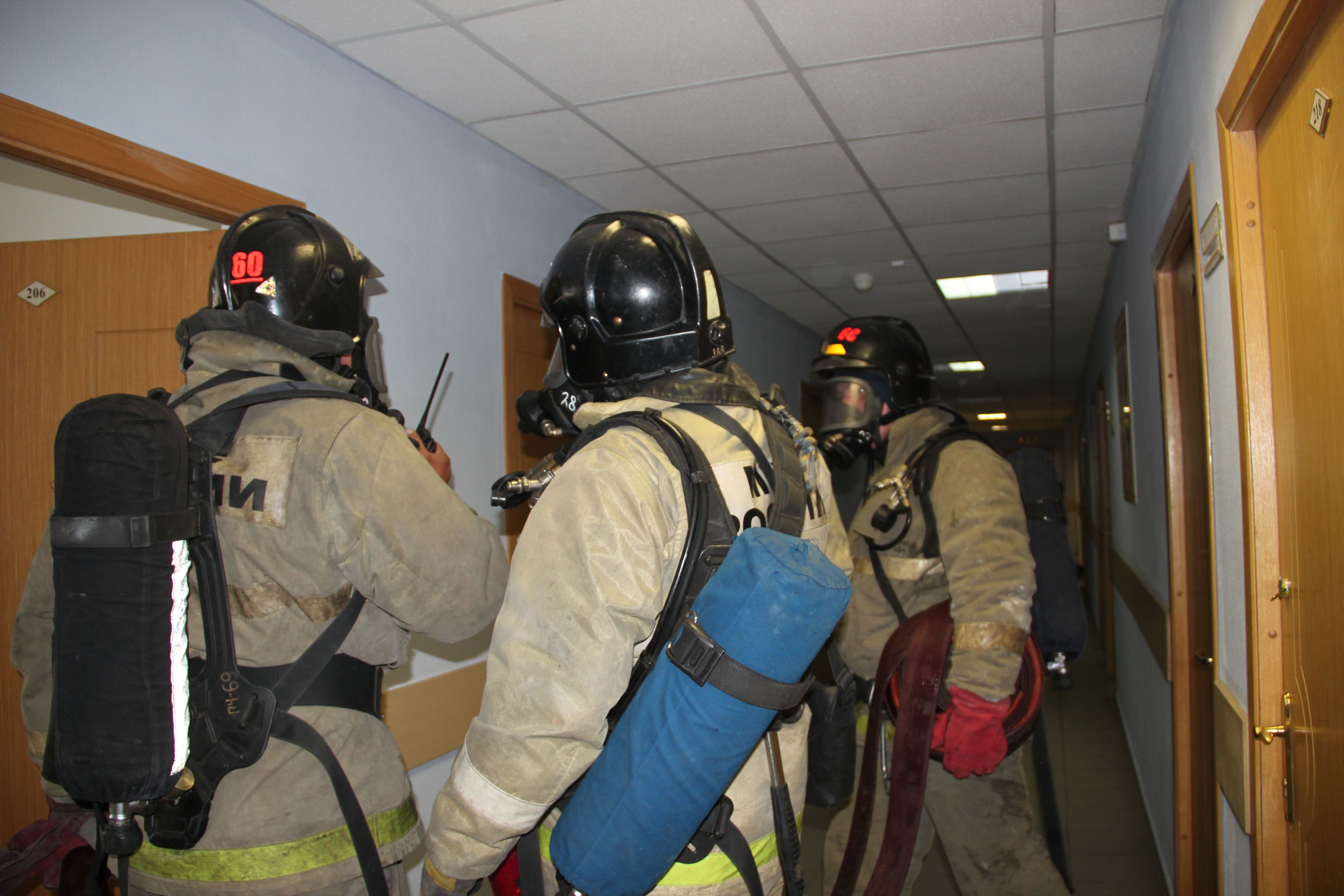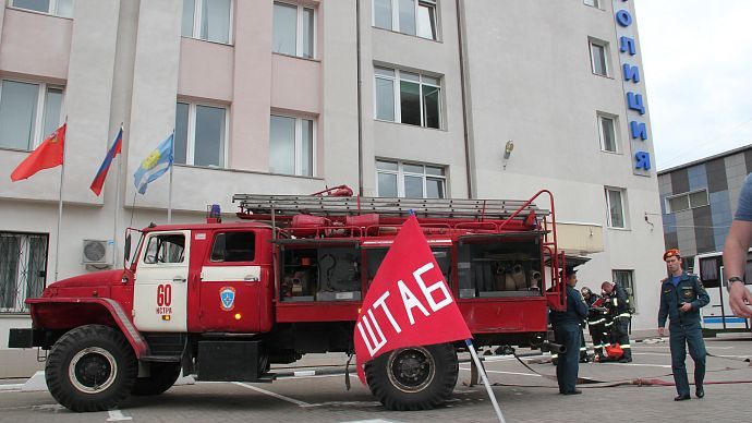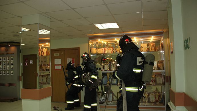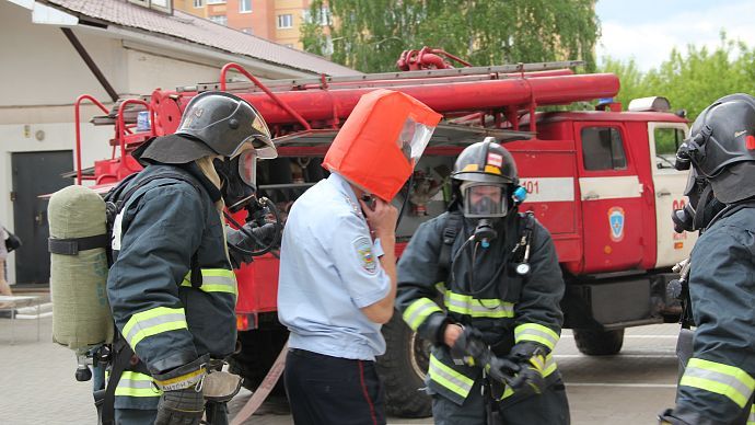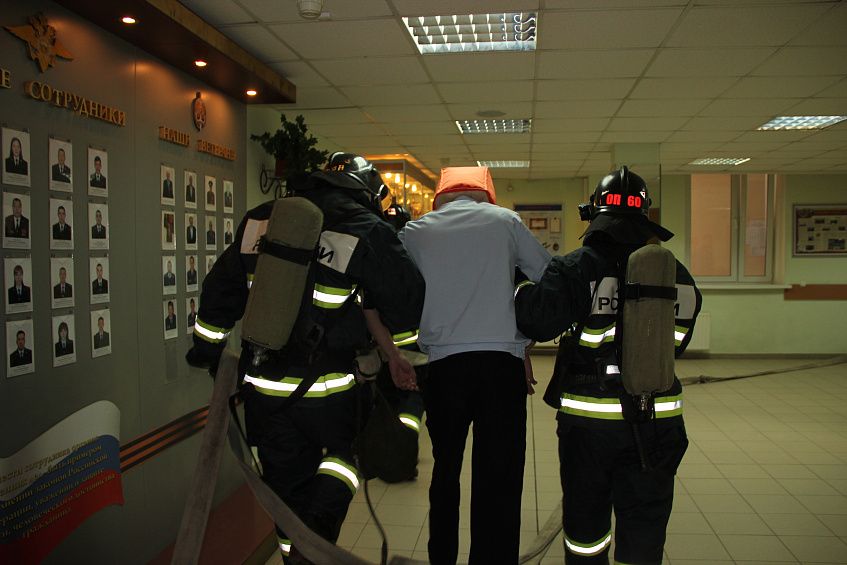 Проведены разведка и проверка помещений здания с подачей ствола на тушение очага условного пожара. Пожар был ликвидирован в кратчайшие сроки. Однако не обошлось и без условного пострадавшего - им оказался сотрудник полиции, находящийся в одном из кабинетов и имевший все шансы задохнуться от угарного газа. "Сгореть на работе" пострадавшему не дали, и он был благополучно с помощью спецсредств выведен из здания.